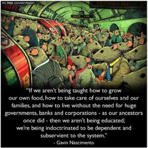 “If we aren’t being taught how to grow our own food, how to take care of ourselves and our families, and how to live without the need for huge governments, banks, or corporations — as our ancestors once did — then we aren’t being educated; we are being indoctrinated to be dependent and subservient to the system.” ~ Gavin Nascimento