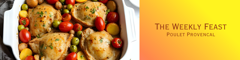 Bake your Poulet Provencal in the oven for 30 minutes, then check. Your chicken should register 165°F, and the potatoes should be ready to eat. If not, return the dish to the oven for 15 more minutes, checking every 5 minutes.