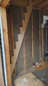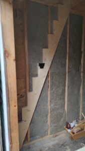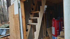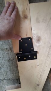 I’m worried about how this will all work when done, but I’m moving forward. Here it is with most of the hinges attached to the wall stringer. The lowest hinge is not attached, but you can’t see that. Three treads have been attached to the wall stringer and two to the moving stringer.