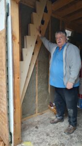 We have a 101.25″ rise and a maximum run of 43.75 inches. We cut the master stringer and lean it against the wall and hold up a hinge and fake tread to give you an idea of what will happen.