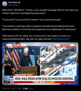 Walz posted this on X on January 7th, after the Good shooting. A number of conservative friends said it was just Walz posturing, flapping his arms and making noise to stay relevant. I don’t think so. His words were exceptionally clear: “To Donald Trump and Kirsti Noem: You’ve done enough. We have soldiers in training, and prepared to be deployed, if necessary.”