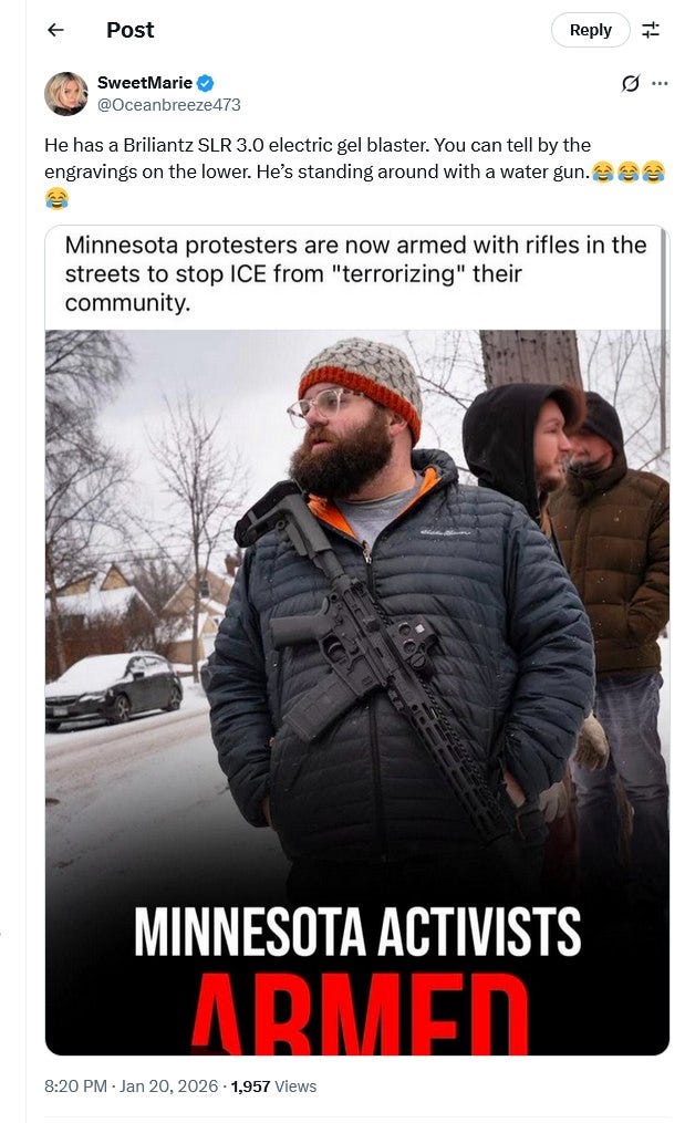 …the 2A applies to people with whom I disagree politically…I have absolutely no issue with Pretti carrying a gun…I commend Pretti for going through all the hurdles that allowed him to legally carry concealed in Minnesota…I stop defending Pretti is at the point that he decided to go hands on with a federal law enforcement officer who was dealing with another protestor…From a legal standpoint, I have a feeling this incident is going to found as falling into the “lawful but awful” category. “Lawful but awful” meaning the shooting is legally justified but could have been avoided.